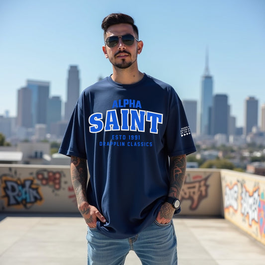Saint Unisex Navy Blue Premium Oversized Typographic Printed T-shirt